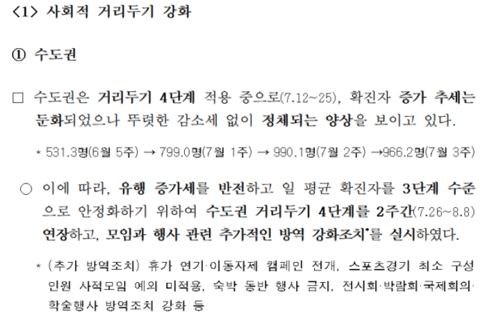 코로나 바이러스 확산세에 따른 정부의 조치로 사회적 거리두기가 수도권은 이미 4단계 실시되고 있고 이번 7월 27일 화요일부터 8월 8일 일요일까지 비수도권 지역 전체에 대해 3단계로 격상되었습니다.