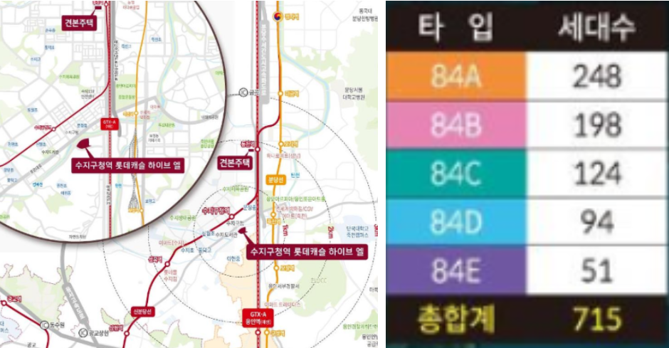 롯데건설은 경기 용인시 기흥구 보정동 (수지구청역 롯데마트 부지)에 " 수지구청역 롯데캐슬 하이브 엘" 아파트를 민간임대 중 장기 민간임대아파트로 공급합니다. 지하 3층~지상 36층, 4개 동, 715가구(전용 84㎡)를 분양합니다. 신분당선 수지구청역 과 수인 분당선 죽전역이 가까운 더블역세권 단지이며 수지구청역에서 강남역까지 25분이면 도달하여 접근성 또한 좋은 입지인 듯합니다.