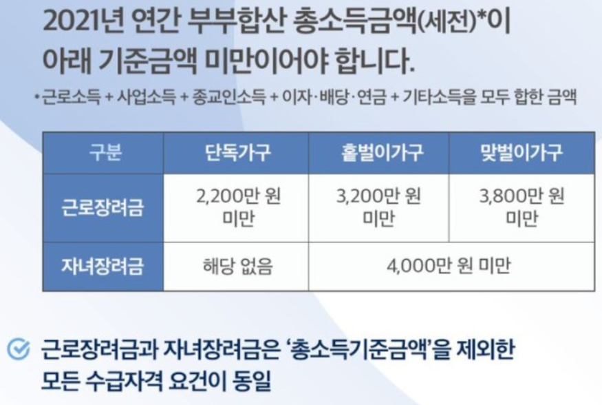 소득이 적은 가구의 자녀양육을 지원하기 위한 복지 제도이며 총소득 4,000만 원 미만이면서 부양자녀가 있는 경우 자녀당 최대 70만원까지 지급 받을 수 있습니다. 총소득기준금액만 근로장려금과 다르나 재산조건은 동일.