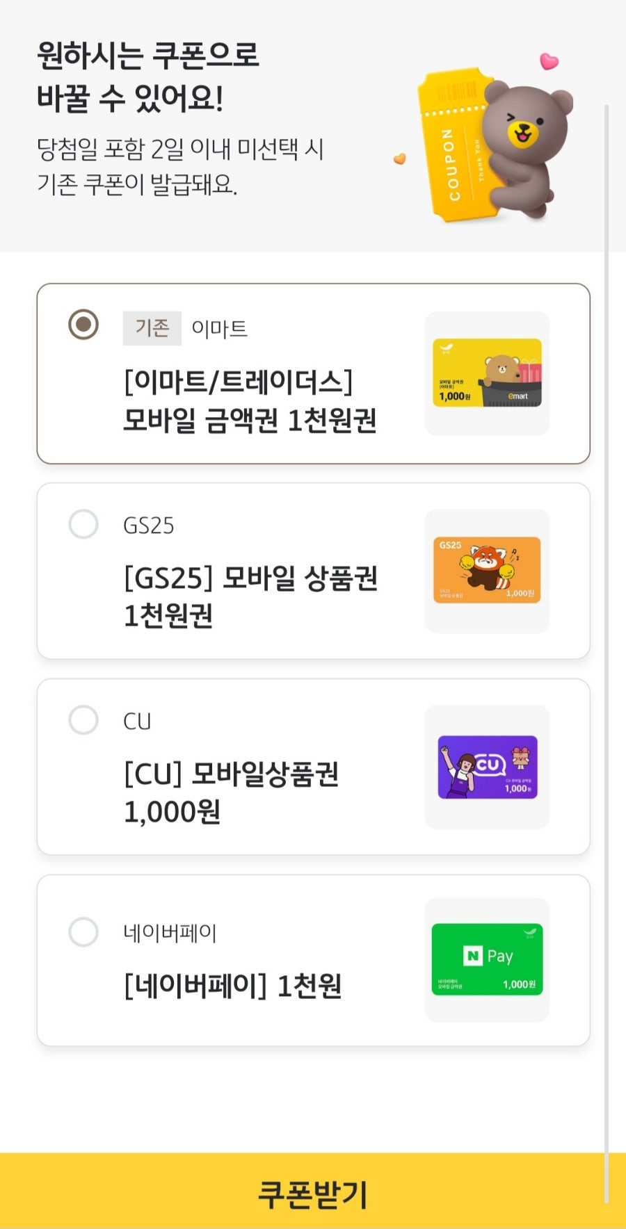 꾕은 없으니 어떤걸 받아도 원하시는 쿠폰으로 변경도 가능합니다