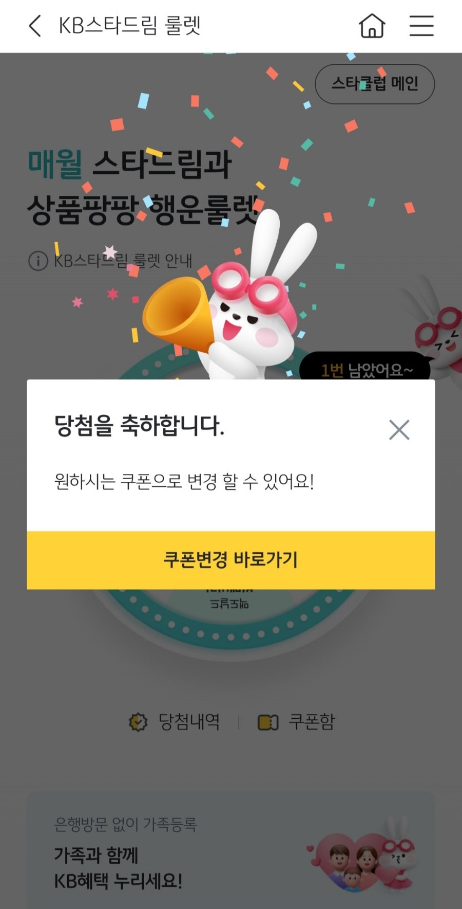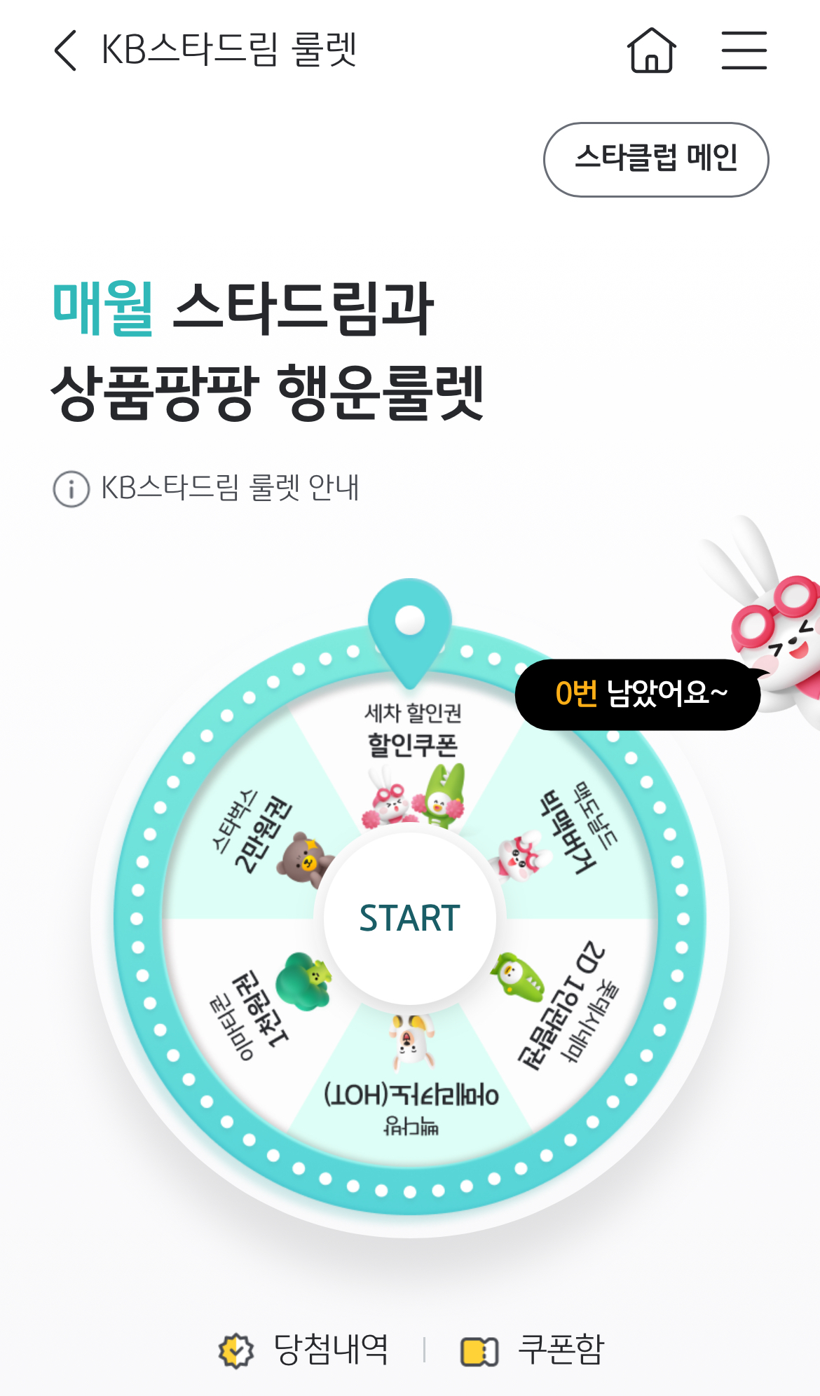 매달 돌아오는 국민은행 스타드림 룰렛! 무료로 참여해 커피 한 잔, 영화 한 편의 행복을 누려보세요.