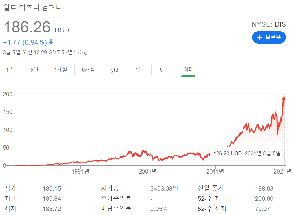 온라인, 오프라인 모두 갖춘 미디어 기업 분야 세계 1위 시총의 전 세계 최고의 엔터테인먼트 기업이라 볼 수 있습니다. 코로나 19로 인해 영화관, 테마파크 모두 40년 만에 첫 적자를 기록했지만 디즈니+ 는 9천만 명 정도의 구독자를 확보했고 ESPN 유료까지 합하면 1억 4천 명 정도 글로벌 구독자를 확보하고 있습니다. 넷플릭스 구독자는 2억 4천 명 정도라서 OTT 분야에서 디즈닌 후발주자이지만 장기적으로는 엄청난 잠재력을 가지고 있다고 전문가들은 판단하고 있습니다.