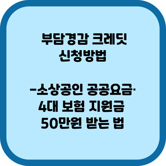 부담경감 크레딧은 연 매출 3억 원 이하의 소상공인을 대상으로 최대 50만 원 상당의 공공요금·4대 보험료 결제 지원금을 지급하는 정부 지원 사업입니다. 신청이 완료되면 본인이 사용하는 신용·체크카드 또는 선불카드에 자동으로 지급되어 해당 요금 납부 시 차감됩니다.