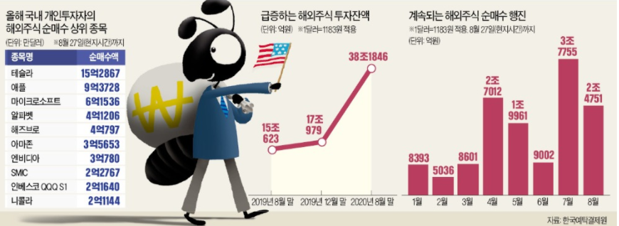 애플, 테슬라, 마이크로소프트 등 해외주식을 작년 한 해 60조 원어치를 매수했다고 합니다. 추가적으로 원화를 달러로 환전하는 과정에서 환차 이득을 볼 수도 있고 손해도 볼 수 있지만 원화 가치를 떨구는 효과도 있어서 우려도 있습니다...