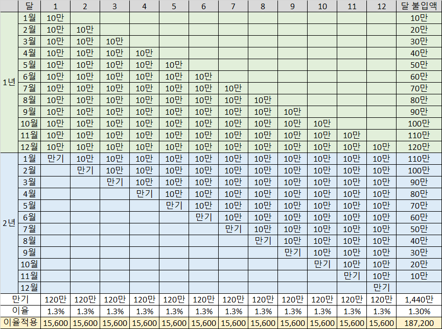 - 1월 달에 1년 만기 연이자 1.3% 월 10만 원 납입하는 적금에 가입