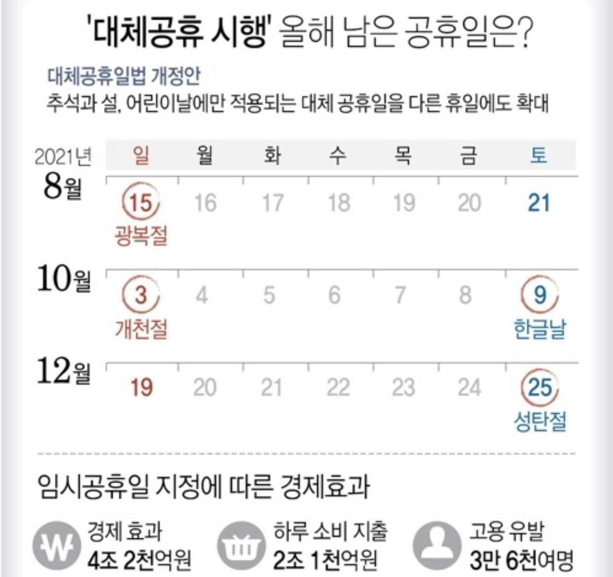 이 법안이 시행되면 주말과 겹치는 올 하반기 광복절, 개천절, 한글날, 성탄절도 대체 공휴일로 추가로 쉴 수 있게 됩니다.